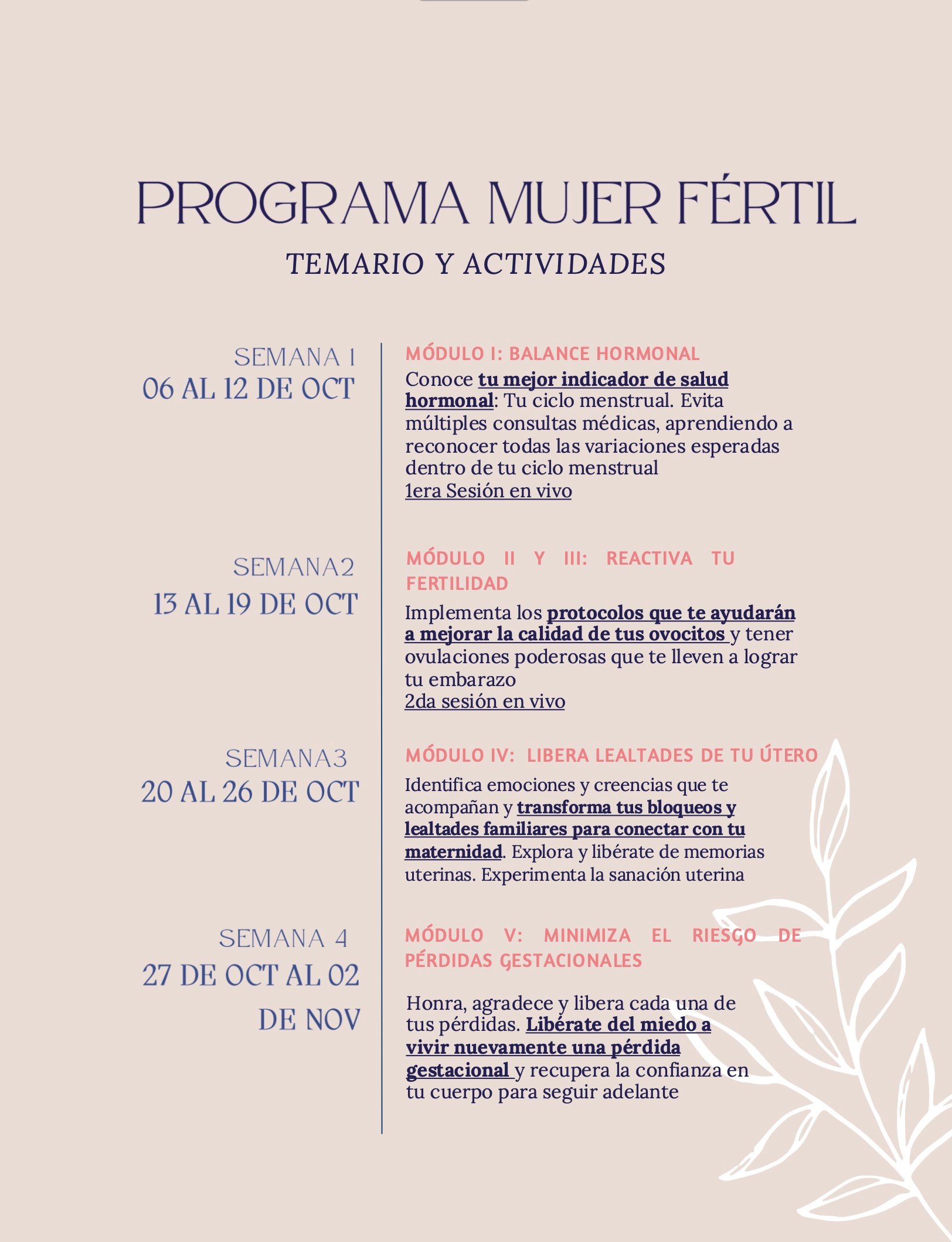 Este programa te permitirá crear las bases de un estilo de vida en sintonía a optimizar tu fertilidad y adicionalmente podrás trabajar en transformar las creencias que te impiden quedar embarazada y ser madre.